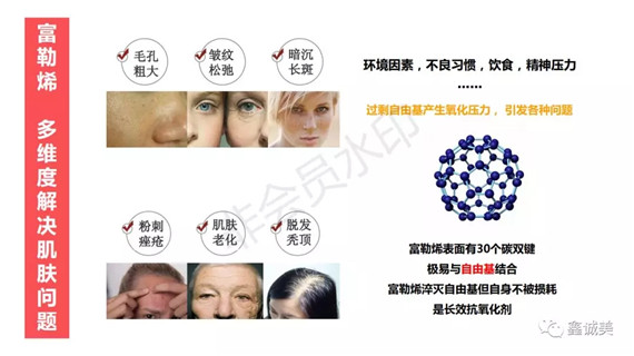 由于富勒烯能够亲和自由基,具有极强的抗氧化能力,能够起到活化皮肤细胞,预防肌肤衰亡的作用。关于富勒烯在清除自由基方面的功效目前已有近3万篇论文被发表,近3千个专利获得了认可。正因如此,21世纪以来富勒烯开始被用作化妆品原料,具有抗皱、美白、预防衰老的卓越价值,成为备受瞩目的尖端美容成分。许多高端护肤品品牌含有富勒烯成分。